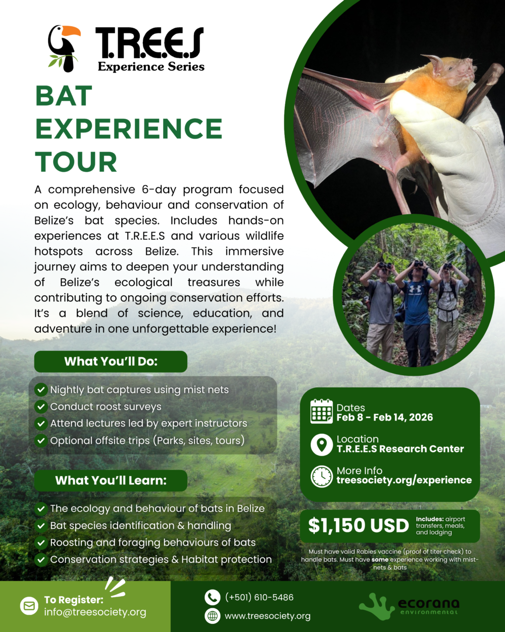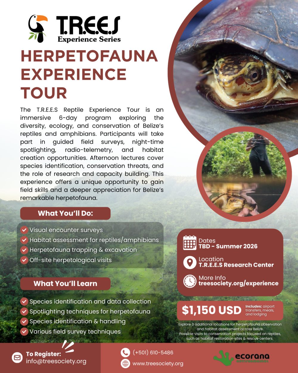 The T.R.E.E.S. Belize Nature Experience Series offers the unique opportunity for participants to immerse themselves in the rich nature and biodiversity of Belize. You will have the chance to learn valuable long-term monitoring and research techniques from trained biologists at our research station in the Maya Mountains. The program includes in-country travel, accommodation, food, hands-on training and visits to various wildlife hotspots across the country. It’s a blend of science, education, and adventure in one unforgettable experience.