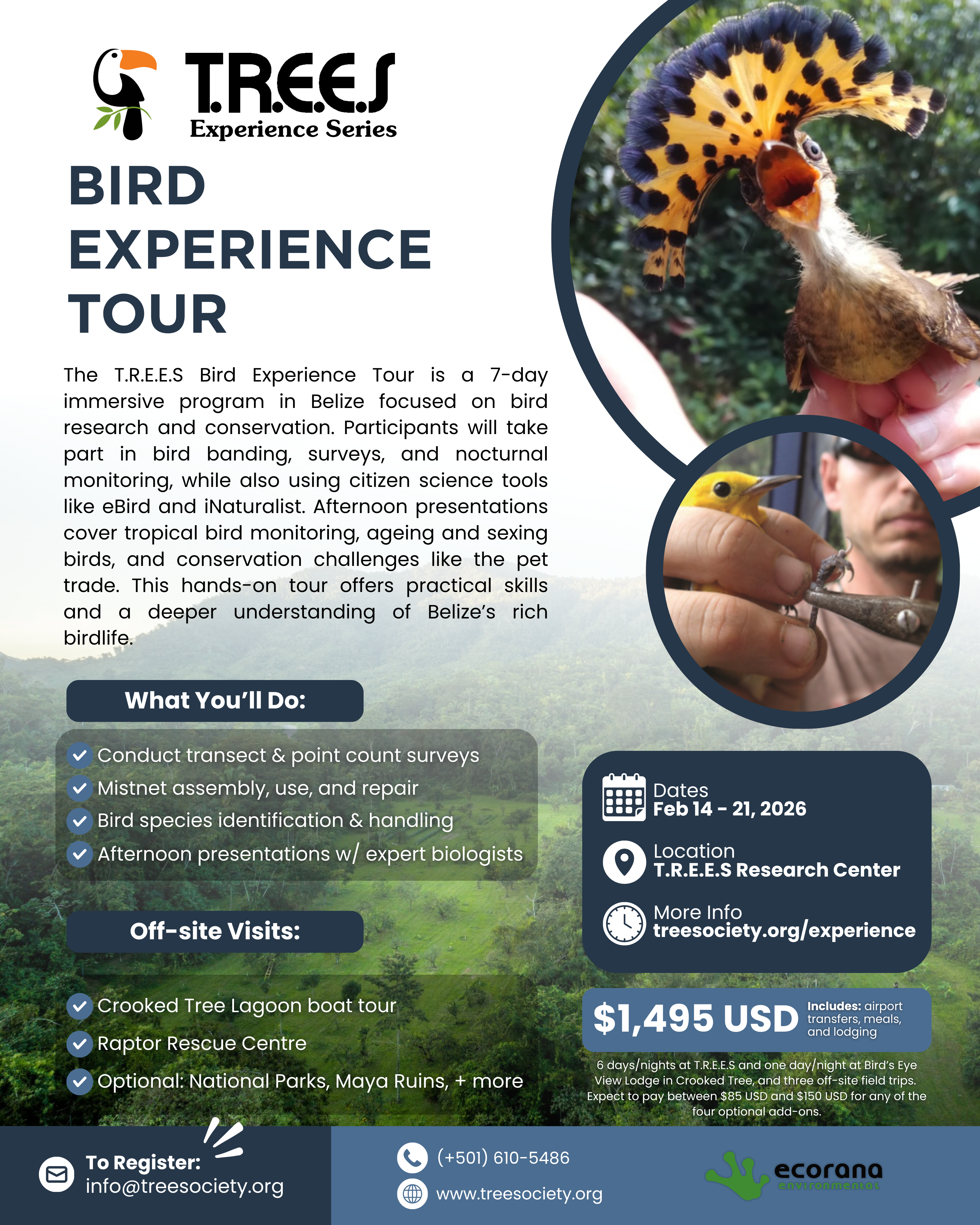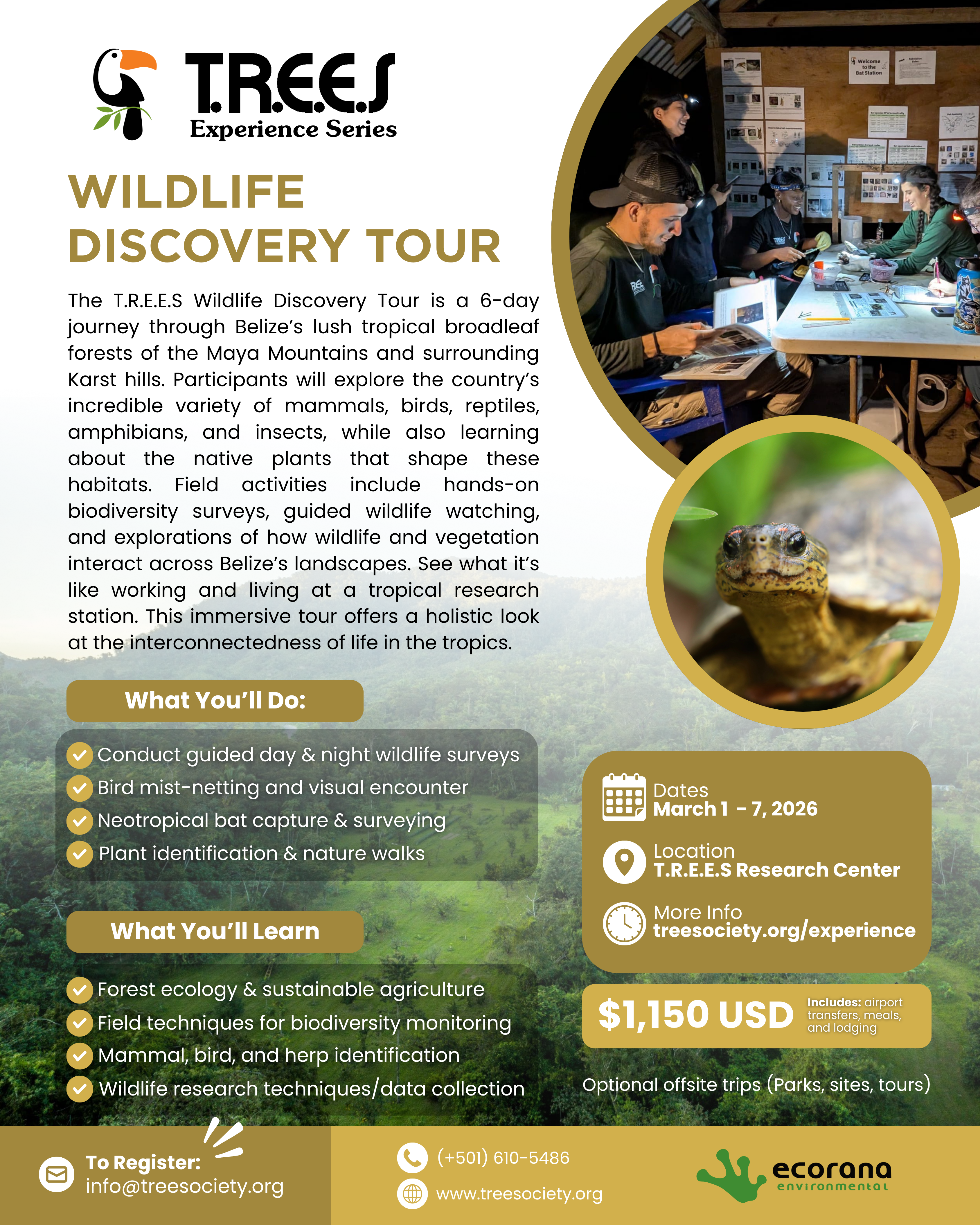 The T.R.E.E.S. Belize Nature Experience Series offers the unique opportunity for participants to immerse themselves in the rich nature and biodiversity of Belize. You will have the chance to learn valuable long-term monitoring and research techniques from trained biologists at our research station in the Maya Mountains. The program includes in-country travel, accommodation, food, hands-on training and visits to various wildlife hotspots across the country. It’s a blend of science, education, and adventure in one unforgettable experience.